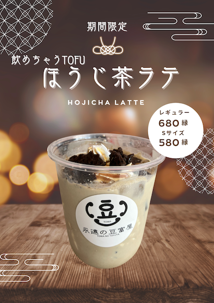 今回の新作は、当店自慢の「飲めちゃうTOFU」シリーズに、秋冬の定番「ほうじ茶ラテ」が仲間入り。