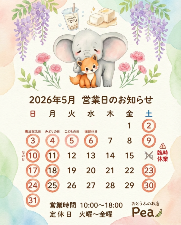 【2026年5月】営業日のお知らせ|GWも母の日も営業します!5/16(土)は臨時休業 | おとうふのお店 Pea